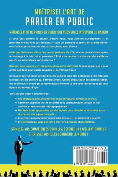 Révélez l'Orateur en Vous : Guide Pratique pour Surmonter l'Introversion et l'Anxiété Comme beaucoup, vous admirez peut-être ceux qui s'expriment avec aisance devant une foule, prononçant des discours inspirants sans la moindre appréhension. Que diriez-vous si vous pouviez devenir l'une de ces personnes ? Si vous pouviez formuler un message si percutant qu'il transformerait votre audience passive en une foule d'adeptes passionnés ? Si vous pouviez le faire avec audace et sans peur ? Imaginez... Pourriez-vous révéler cette idée commerciale brillante qui a germé dans votre esprit ? Qu'il serait formidable de convaincre régulièrement les gens de la valeur de vos idées. Pensez aux opportunités qui s'ouvriraient à vous. Pourriez-vous élargir votre cercle social et rencontrer des dizaines de personnes extraordinaires sans la moindre crainte ? Imaginez un monde aux possibilités infinies. Utiliseriez-vous votre talent unique de persuasion pour devenir un avocat ou un influenceur qui fait la différence dans les domaines qui vous tiennent à c¿ur ? Êtes-vous prêt à vous lancer dans ce qui vous passionne et à vous exprimer avec sincérité ? Trouvez votre voix unique. Cet objectif est réalisable, même si vous êtes profondément introverti, même si vous avez peur de parler en public depuis votre enfance, et même si, comme l'auteur Gerard Shaw, vous pensiez un jour ne pas être fait pour être sous les projecteurs. Laissez-vous détromper. Il est clair que vous voulez vous démarquer ! Ne vous retenez plus de briller parce que vous pensez manquer de compétences spécifiques en communication. L'art de l'éloquence, comme toutes compétences, peut être acquis. Gerard Shaw, votre coach en communication, est là pour vous accompagner. Introverti de nature, il comprend intimement les défis que rencontrent les personnes timides. Que vous soyez timide ou non, ce livre regroupe des informations précieuses pour ceux qui aspirent à exceller sur scène. Ce guide vous fournira :Des stratégies pour surmonter vos peurs et renforcer votre confiance en vous. Des conseils d'un expert en communication qui comprend le parcours des introvertis. Une approche pour faire face à vos peurs avec succès et efficacité. Des techniques pour combattre la nervosité et découvrir votre propre voix. Des façons d'améliorer votre image de soi et de transmettre un message puissant. Des moyens pour établir une connexion plus profonde avec votre public. Des conseils pour émaner une forte présence tout en étant agréable. Des stratégies pour créer un impact sur scène et maximiser la communication verbale et non verbale. Des techniques validées par des experts pour planifier et structurer votre discours et vos supports visuels. Des recommandations pour reconnaître et éviter les erreurs courantes lors de votre discours. Des exemples de discours inspirants et des success stories de personnalités célèbres. Contrairement à d'autres ouvrages sur la prise de parole en public, ce livre est unique. Il vous offre un guide étape par étape pour progresser de manière tranquille et régulière. Il trace un chemin simple à suivre pour devenir un orateur exceptionnel, charismatique et captivant sur scène. Découvrez votre potentiel d'orateur, que vous soyez introverti ou extraverti, débutant ou professionnel, ce livre vous apporte plus. Vous pouvez être plus performant que vous ne l'imaginez. Il est temps de vous placer sous les feux de la rampe et de vous donner les moyens de réussir ! Développez vos talents d'orateur, communiquez avec impact et laissez vos idées conquérir le monde !