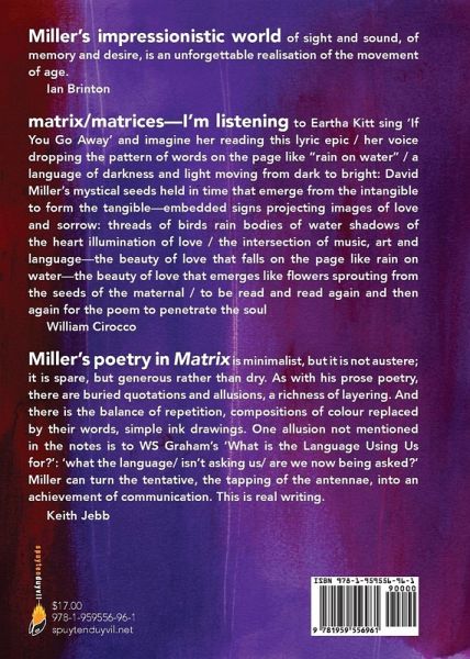 Miller's poetry in Matrix is minimalist, but it is not austere; it is spare, but generous rather than dry. As with his prose poetry, there are buried quotations and allusions, a richness of layering. And there is the balance of repetition, compositions of colour replaced by their words, simple ink drawings.