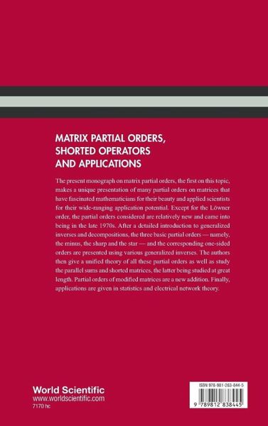 The present monograph on matrix partial orders, appearing for the first time, is a unique presentation of many partial orders on matrices that have fascinated mathematicians for their beauty and applied scientists for their wide-ranging application potential. Except for the Lwner order, the partial orders considered are relatively new and came into being in the late 1970s. After a detailed introduction to generalized inverses and decompositions, the three basic partial orders namely, the minus, the sharp and the star and the corresponding one-sided orders are presented using various generalized inverses. The authors then give a unified theory of all these partial orders. This is followed by a study of the Lwner order and a limited treatment of majorization (there is an abundance of literature available on majorization). The authors also study the parallel sums and shorted matrices, the latter being studied at great length. Partial orders of modified matrices are a new addition. Finally, applications are given in statistics and electrical network theory.