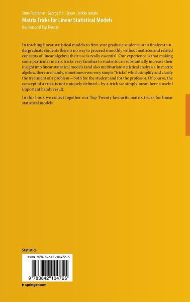 "This new book is closely connected with matrices and linear models ... . the authors extract from the matrix algebra and theory of linear models twenty key results or ideas which they call 'tricks'. ... This exceptional book can be recommended to all interested students who wish to improve their skills in linear models and matrix manipulations. It can be recommended also to professors teaching statistics who may utilize this book as a rich source of various exercises, references and interesting historical notes." (Radoslaw Kala, IMAGE, Issue 48, Spring, 2012)