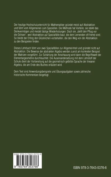 Der heutige Hochschulunterricht für Mathematiker gründet meist auf Abstraktion und führt vom Allgemeinen zum Speziellen. Die Methode hat Vorteile, sie stärkt das Denkvermögen und meidet lästige Wiederholungen. Doch sie "stellt den Pflug vor die Ochsen", weil Abstraktion auf Spezialfälle baut, die dem Lernenden oft fremd sind. So bleibt der Erfolg den Glücklichen vorbehalten, die den Weg von der Abstraktion zu den Beispielen finden. Dieses Lehrbuch führt von zwei Spezialfällen zur Allgemeinheit und gründet nicht auf Abstraktion. Die Beweise der abstrakten Algebra werden zuerst am konkreten Beispiel der Matrizen vorgeführt. Zur Schärfung der Anschauung wird dann die Begriffswelt der Elementargeometrie durchleuchtet. Die Auseinandersetzung mit dem Lehrstoff der Schule dient der Vorbereitung auf die geometrisch gefärbte Sprache der linearen Algebra, die am Ende des Buches erläutert wird. Dem Text sind Anwendungsbeispiele und zahlreiche historische Kommentare beigefügt.