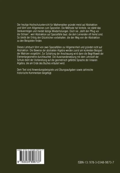 Der heutige Hochschulunterricht für Mathematiker gründet meist auf Abstraktion und führt vom Allgemeinen zum Speziellen. Die Methode hat Vorteile, sie stärkt das Denkvermögen und meidet lästige Wiederholungen. Doch sie "stellt den Pflug vor die Ochsen", weil Abstraktion auf Spezialfälle baut, die dem Lernenden oft fremd sind. So bleibt der Erfolg den Glücklichen vorbehalten, die den Weg von der Abstraktion zu den Beispielen finden. Dieses Lehrbuch führt von zwei Spezialfällen zur Allgemeinheit und gründet nicht auf Abstraktion. Die Beweise der abstrakten Algebra werden zuerst am konkreten Beispiel der Matrizen vorgeführt. Zur Schärfung der Anschauung wird dann die Begriffswelt der Elementargeometrie durchleuchtet. Die Auseinandersetzung mit dem Lehrstoff der Schule dient der Vorbereitung auf die geometrisch gefärbte Sprache der linearen Algebra, die am Ende des Buches erläutert wird. Dem Text sind Anwendungsbeispiele und zahlreiche historische Kommentare beigefügt.