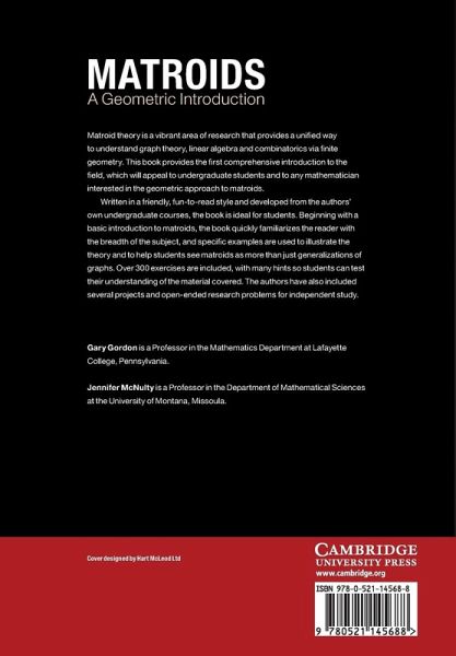 'Matroid theory is a vibrant area of research that provides a unified way to understand graph theory, linear algebra and combinatorics via finite geometry. This book provides the first comprehensive introduction to the field which will appeal to undergraduate students and to any mathematician interested in the geometric approach to matroids. Written in a friendly, fun-to-read style and developed from the authors' own undergraduate courses, the book is ideal for students. Beginning with a basic introduction to matroids, the book quickly familiarizes the reader with the breadth of the subject, and specific examples are used to illustrate the theory and to help students see matroids as more than just generalizations of graphs. Over 300 exercises are included, with many hints and solutions so students can test their understanding of the materials covered. The authors have also included several projects and open-ended research problems for independent study.Matroids provides a unified way to understand graph theory, linear algebra and combinatorics via finite geometry. This informal text provides a comprehensive introduction to matroid theory that emphasizes its connections to geometry and is suitable for undergraduates. It includes over 300 exercises, examples and projects suitable for independent study.