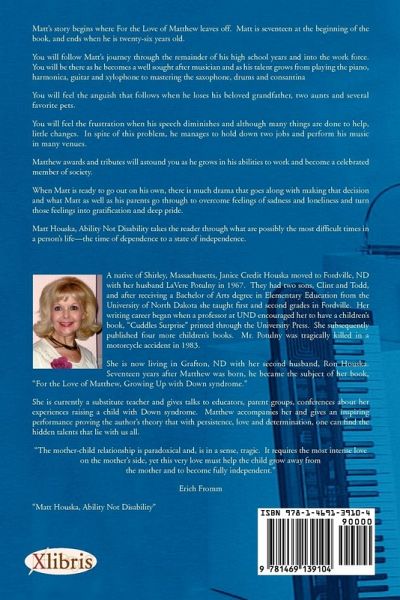 Matt's story begins where For the Love of Matthew leaves off. Matt is seventeen at the beginning of the book, and ends when he is twenty-six years old. You will follow Matt's journey through the remainder of his high school years and into the work force. You will be there as he becomes a well sought after musician and as his talent grows from playing the piano, harmonica, guitar and xylophone to mastering the saxophone, drums and consantina. You will feel the anguish that follows when he loses his beloved grandfather, two aunts and several favorite pets. You will feel the frustration when his speech diminishes and although many things are done to help, little changes. In spite of this problem, he manages to hold down two jobs and perform his music in many venues. Matthew awards and tributes will astound you as he grows in his abilities to work and become a celebrated member of society. When Matt is ready to go out on his own, there is much drama that goes along with making that decision and what Matt as well as his parents go through to overcome feelings of sadness and loneliness and turn those feelings into gratification and deep pride. Matt Houska, Ability Not Disability takes the reader through what are possibly the most difficult times in a person's life¿the time of dependence to a state of independence. "The mother-child relationship is paradoxical and, is in a sense, tragic. It requires the most intense love on the mother's side, yet this very love must help the child grow away from the mother and to become fully independent." Erich Fromm