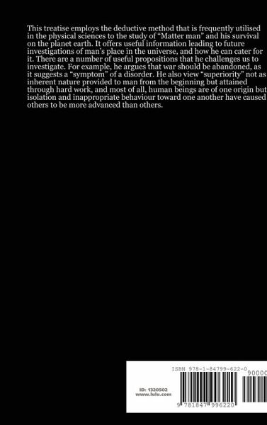 This treatise employs the deductive method that is frequently utilised in the physical sciences to the study of "Matter man" and his survival on the planet earth. It offers useful information leading to future investigations of man's place in the universe, and how he can cater for it. There are a number of useful propositions that he challenges us to investigate. For example, he argues that war should be abandoned, as it suggests a "symptom" of a disorder. He also view "superiority" not as inherent nature provided to man from the beginning but attained through hard work, and most of all, human beings are of one origin but isolation and inappropriate behaviour toward one another have caused others to be more advanced than others.