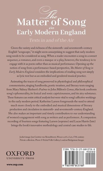 Given the variety and richness of the sixteenth- and seventeenth-century English 'songscape', it might seem unsurprising to suggest that early modern song needs to be considered as sung. When a reader encounters a song in a sonnet sequence, a romance, and even a masque or a play, however, the tendency is to engage with it as poem rather than as musical performance. Opening up the notion of song from a performance-based perspective The Matter of Song in Early Modern England considers the implications of reading song not simply as lyric text but as an embodied and gendered musical practice. Animating the traces of song preserved in physiological and philosophical commentaries, singing handbooks, poetic treatises, and literary texts ranging from Mary Sidney Herbert's Psalmes to John Milton's Comus, the book confronts song's ephemerality, its lexical and sonic capriciousness, and its airy substance. These features can resist critical analysis but were vital to song's affective workings in the early modern period. The volume foregrounds the need to attend much more closely to the embodied and musical dimensions of literary production and circulation in sixteenth- and seventeenth-century England. It also makes an important and timely contribution to our understanding of women's engagement with song as writers and as performers. A companion recording of fourteen songs featuring Larson (soprano) and Lucas Harris (lute) brings the project's innovative methodology and central case studies to life.
