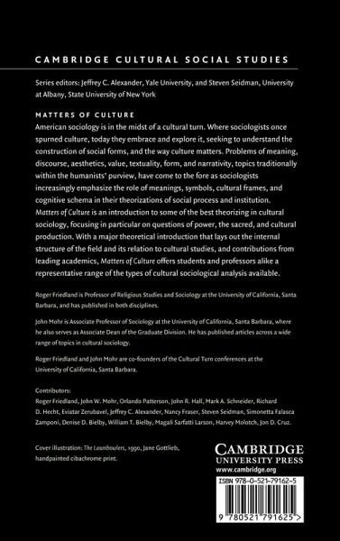 American sociology is in the midst of a cultural turn. Where sociologists once spurned culture, today they embrace and explore it, seeking to understand the construction of social forms and the way culture matters. Problems of meaning, discourse, aesthetics, value, textuality, form and narrativity, topics traditionally within the humanists' purview, have come to the fore as sociologists increasingly emphasize the role of meanings, symbols, cultural frames and cognitive schema in their theorizations of social process and institution. Matters of Culture, first published in 2004, is an introduction to some of the best theorizing in cultural sociology, focusing in particular on questions of power, the sacred and cultural production. With a major theoretical introduction that lays out the internal structure of the field and its relation to cultural studies and contributions from leading academics Matters of Culture offers students and professors alike a representative range of the types of cultural sociological analysis available.