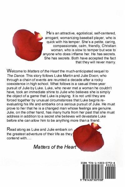He's an attractive, egotistical, womanizing baseball player. She's a caring, friendly, Christian woman. He has secrets. She has secrets. Both have accepted the fact that they will never marry. Welcome to "Matters of the Heart" the much-awaited sequel of "The Dance". This story follows Luke Martin and Julie Dixon, who are reunited a decade after a rocky coexistence in high school. What follows is a casual three-year pursuit of Julie by Luke. Luke, who never met a woman he couldn't have, takes an immediate shine to Julie who believes she is simply the object of a game that he is playing. It isn't until they are forced together by unusual circumstances that Luke begins rethinking his life and begins a serious pursuit of Julie. He must prove to her that he is a changing man and that his feelings for her are genuine. Julie, however, has many hurts from her past that she must address, in addition to a secret she thinks will devastate Luke, before she can allow him to be anything more than a friend.