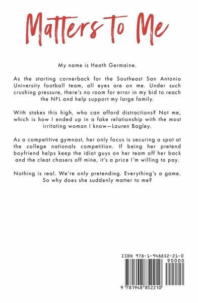 My name is Heath Germaine. As the starting cornerback for the Southeast San Antonio University football team, all eyes are on me. Under such crushing pressure, there's no room for error in my bid to reach the NFL and help support my large family. With stakes this high, who can afford distractions? Not me, which is how I ended up in a fake relationship with the most irritating woman I know - Lauren Bagley. As a competitive gymnast, her only focus is securing a spot at the college nationals competition. If being her pretend boyfriend helps keep the idiot guys on her team off her back and the cleat chasers off mine, it's a price I'm willing to pay. Nothing is real. We're only pretending. Everything's a game. So why does she suddenly matter to me?