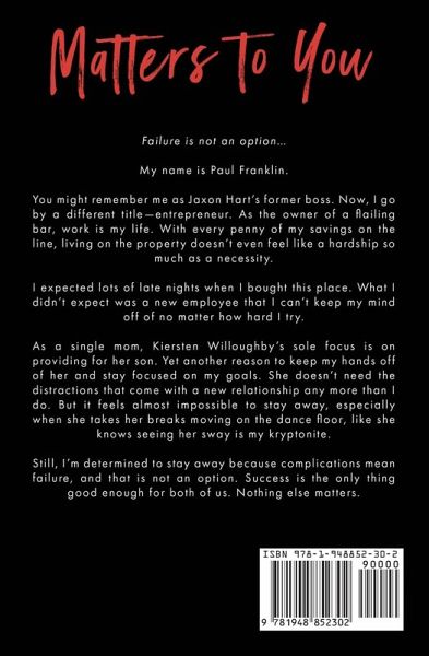 Failure is not an option... My name is Paul Franklin. You might remember me as Jaxon Hart's former boss. Now, I go by a different title - entrepreneur. As the owner of a flailing bar, work is my life. With every penny of my savings on the line, living on the property doesn't even feel like a hardship so much as a necessity. I expected lots of late nights when I bought this place. What I didn't expect was a new employee that I can't keep my mind off of no matter how hard I try. As a single mom, Kiersten Willoughby's sole focus is on providing for her son. Yet another reason to keep my hands off of her and stay focused on my goals. She doesn't need the distractions that come with a new relationship any more than I do. But it feels almost impossible to stay away, especially when she takes her breaks moving on the dance floor, like she knows seeing her sway is my kryptonite. Still, I'm determined to stay away because complications mean failure, and that is not an option. Success if the only thing good enough for both of us. Nothing else matters.