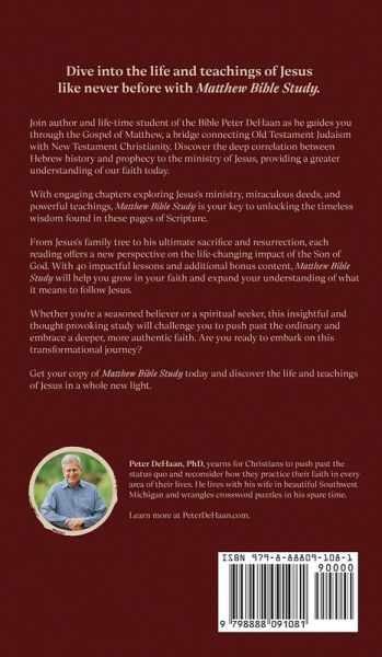 Dive into the life and teachings of Jesus like never before with Matthew Bible Study. Join author and life-time student of the Bible Peter DeHaan as he guides you through the Gospel of Matthew, a bridge connecting Old Testament Judaism with New Testament Christianity. Discover the deep correlation between Hebrew history and prophecy to the ministry of Jesus, providing a greater understanding of our faith today. With engaging chapters exploring Jesus's ministry, miraculous deeds, and powerful teachings, Matthew Bible Study is your key to unlocking the timeless wisdom found in these pages of Scripture. From Jesus's family tree to his ultimate sacrifice and resurrection, each reading offers a new perspective on the life-changing impact of the Son of God. With 40 impactful lessons and additional bonus content, Matthew Bible Study will help you grow in your faith and expand your understanding of what it means to follow Jesus. Whether you're a seasoned believer or a spiritual seeker, this insightful and thought-provoking study will challenge you to push past the ordinary and embrace a deeper, more authentic faith. Are you ready to embark on this transformational journey? Get your copy of Matthew Bible Study today and discover the life and teachings of Jesus in a whole new light.