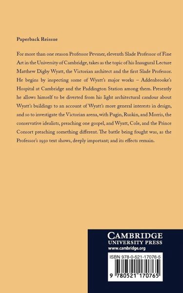 For more than one reason Professor Pevsner, eleventh Slade Professor of Fine Art in the University of Cambridge, takes as the topic of his Inaugural Lecture Matthew Digby Wyatt, the Victorian architect and the first Slade Professor. He begins by inspecting some of Wyatt's major works - Addenbrooke's Hospital at Cambridge and the Paddington Station among them. Presently he allows himself to be diverted from his light architectural candour about Wyatt's buildings to an account of Wyatt's more general interests in design, and so to investigate the Victorian arena, with Pugin, Ruskin, and Morris, the conservative idealists, preaching one gospel, and Wyatt, Cole, and the Prince Consort preaching something different. The battle being fought was, as the Professor's 1950 text shows, deeply important; and its effects remain.