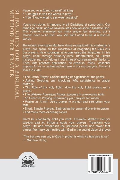 31 Biblical Insights for Learning How to Pray I struggle to find the words to pray! I don't know what to say when praying! Have you ever found yourself in this position or said something like this? It happens to all Christians at some point. Our minds go blank, and we have no idea how we should speak to God. But we don't need to be at a loss for words. Matthew Henry saw the importance of keeping the Bible close, especially when praying. He even encourages us to pray using Bible verses. Applying scripture, he reveals incredible truths to help us in our times of conversing with Jesus. Then, with practical application, he explains many essential aspects for us to understand and use in our own prayers: The Lord's Prayer Why we should ask, seek and knock How the Holy Spirit helps us The widow's persistent prayer An order for praying Using prayer as armor Short, simple prayers Henry's biblical insights will open your mind and heart to see prayer in its proper place in your life. Using a verse-by-verse interpretation, he unpacks the secrets of what makes prayer so unique and how we can use it effectively to grow as Christians. "The best we can say to God in prayer is what He has said to us."¿ Matthew Henry.