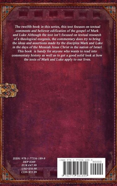 The twelfth book in this series, this text focuses on textual comments and believer edification of the gospel of Mark and Luke Although the text isn't focused on textual research of a theological exegesis, the commentary does try to bring the ideas and assertions made by the disciples Mark and Luke in the days of the Messiah Jesus Christ in the nation of Israel. This book is handy for anyone who wants to read into commentary history as well as to get a good solid look at how the texts of Mark and Luke apply to our lives.