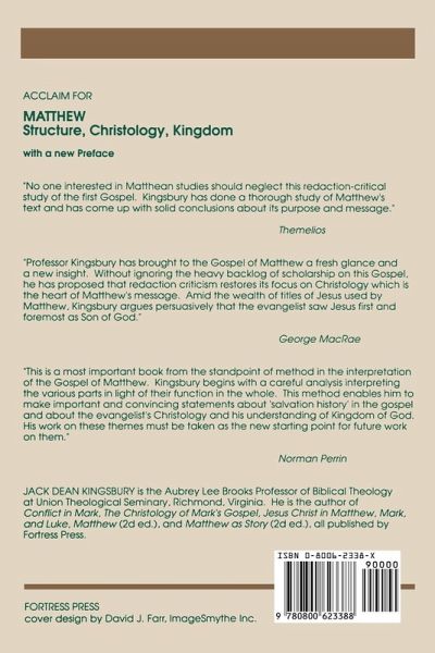 This book attempts a solution to the problems of the structure, christology, and Kingdom-theology of the Gospel according to St. Matthew. The author contends that the broad structure of the Gospel consists of three main parts: the person of Jesus Messiah, the proclamation of Jesus Messiah, and the suffering, death, and resurrection of Jesus Messiah. This understanding of the broad structure of Matthew's Gospel opens the way to a proper understanding of his christology. That is, for Matthew Jesus is first and foremost the Messiah, the Son of God. Kingbury's analysis of the texts in which "Son of God" appears, and of the numerous other christological terms Matthew employs, confirms this conclusion. Professor Kingbury demonstrates how Matthew develops both the structure and the primary theological concept of his Gospel, "The Kingdom of Heaven," around the christological category of "the Son of God." A rigorous conclusion reached is that the focus of the Gospel of Matthew is revealed more in his christology than in his ecclesiology.