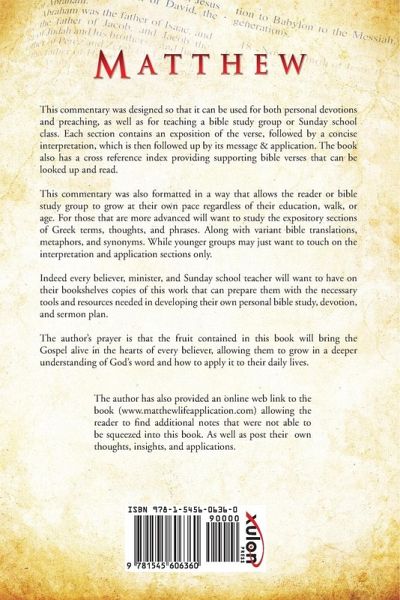 This commentary was designed so that it can be used for both personal devotions and preaching, as well as for teaching a bible study group or Sunday school class. Each section contains an exposition of the verse, followed by a concise interpretation, which is then followed up by its message & application. The book also has a cross reference index providing supporting bible verses that can be looked up and read. This commentary was also formatted in a way that allows the reader or bible study group to grow at their own pace regardless of their education, walk, or age. For those that are more advanced will want to study the expository sections of Greek terms, thoughts, and phrases. Along with variant bible translations, metaphors, and synonyms. While younger groups may just want to touch on the interpretation and application sections only. Indeed every believer, minister, and Sunday school teacher will want to have on their bookshelves copies of this work that can prepare them with the necessary tools and resources needed in developing their own personal bible study, devotion, and sermon plan. The author's prayer is that the fruit contained in this book will bring the Gospel alive in the hearts of every believer, allowing them to grow in a deeper understanding of God's word and how to apply it to their daily lives. The author has also provided an online web link to the book (www.matthewlifeapplication.com) allowing the reader to find additional notes that were not able to be squeezed into this book. As well as post their own thoughts, insights, and applications.