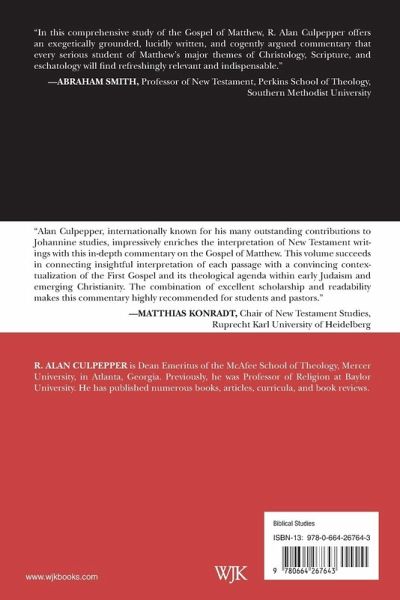 In this new critical commentary for the New Testament Library series, R. Alan Culpepper sets the Gospel of Matthew in the context of the competing Jewish and early Christian voices of the first century, bringing greater clarity to Matthew's own proclamation of the gospel and inviting readers to give up perhaps long-held assumptions about the book. In Culpepper's treatment, Matthew emerges as a Gospel for a Jewish community, distinguishing itself from the Pharisees on one side and other early Christian traditions and leaders, especially Paul and his followers, on the other side. In this framework, Matthew calls his community to faithful observance of the law, a law-observant mission to both Jews and Gentiles, and repentance and the practice of forgiving in preparation for the coming judgment. Accordingly, Matthew takes readers back to an early period, before the separation of Jewish Christians from the synagogues. By taking seriously Matthew's Jewishness, this volume also enables readers to hear the historical Jesus more clearly. Excursuses on Matthew's social setting include Jesus as healer, Sabbath observance, Roman taxation, the Pharisees, the tithes, ancient weddings, and the Sanhedrin, as well as many shorter units on Second Temple Judaism, synagogues, and first-century Galilean society. The New Testament Library series offers authoritative commentary on every book and major aspect of the New Testament, providing fresh translations based on the best available ancient manuscripts, critical portrayals of the historical world in which the books were created, careful attention to their literary design, and a theologically perceptive exposition of the biblical text. The contributors are scholars of international standing. The editorial board consists of C. Clifton Black, Princeton Theological Seminary; John T. Carroll, Union Presbyterian Seminary; and Susan E. Hylen, Candler School of Theology, Emory University.