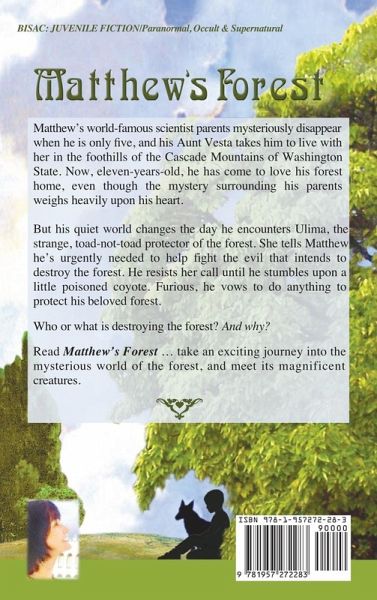 Matthew's Forest Matthew's world-famous scientist parents mysteriously disappear when he is only five, and his Aunt Vesta takes him to live with her in the foothills of the Cascade Mountains of Washington State. Now, eleven-years-old, he has come to love his forest home, even though the mystery surrounding his parents weighs heavily upon his heart. But his quiet world changes the day he encounters Ulima, the strange, toad-not-toad protector of the forest. She tells Matthew he's urgently needed to help fight the evil that intends to destroy the forest. He resists her call until he stumbles upon a little poisoned coyote. Furious, he vows to do anything to protect his beloved forest. Who or what is destroying the forest? And why? Read Matthew's Forest to take an exciting journey into the mysterious world of the forest, and to become acquainted with its magnificent creatures. Read Matthew's Forest - A Thrilling Story!