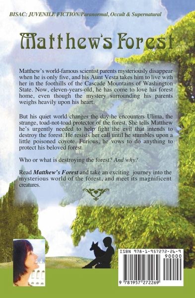 Matthew's Forest Matthew's world-famous scientist parents mysteriously disappear when he is only five, and his Aunt Vesta takes him to live with her in the foothills of the Cascade Mountains of Washington State. Now, eleven-years-old, he has come to love his forest home, even though the mystery surrounding his parents weighs heavily upon his heart. But his quiet world changes the day he encounters Ulima, the strange, toad-not-toad protector of the forest. She tells Matthew he's urgently needed to help fight the evil that intends to destroy the forest. He resists her call until he stumbles upon a little poisoned coyote. Furious, he vows to do anything to protect his beloved forest. Who or what is destroying the forest? And why? Read Matthew's Forest to take an exciting journey into the mysterious world of the forest, and to become acquainted with its magnificent creatures. Read Matthew's Forest - A Thrilling Story!