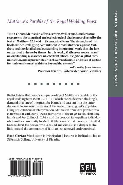 Ruth Christa Mathieson's unique reading of Matthew's parable of the royal wedding feast (Matt 22:1-14), which concludes with the king's demand that one of the guests be bound and cast out into the outer darkness, focuses on the means of the underdressed guest's expulsion. Using sociorhetorical interpretation, Mathieson draws the parable into conversation with early Jewish narratives of the angel Raphael binding hands and feet (1 Enoch; Tobit) and the protocol for expelling individuals from the community in Matt 18. She asserts that readers are invited to consider if the person who is bound and cast out is a danger to the little ones of the community of faith unless removed and restrained.