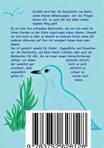 Erzählt wird hier die Geschichte von Matti, einem kleinen Möwenjungen, der das Fliegen lernen soll, es auch will und dabei seinen eigenen Weg geht.Es ist eine frei erfundene Geschichte, wie sie sich einst im hohen Norden an der Küste zugetragen haben könnte. Obwohl sie sich auch so oder so ähnlich an anderen Orten sowie mit anderen Akteuren auf ihre Art ereignet haben kann oder könnte.Sie ist gedacht sowohl für Kinder, Jugendliche und Erwachsene: Als Geschichte, Gute-Nacht-Lektüre oder auch als Mutmacher für alle, die vor einer neuen Herausforderung stehen; vor einem nächsten Schritt, der zunächst gar nicht so groß erscheint und dann plötzlich so unglaublich schwer zu gehen ist, warum auch immer...