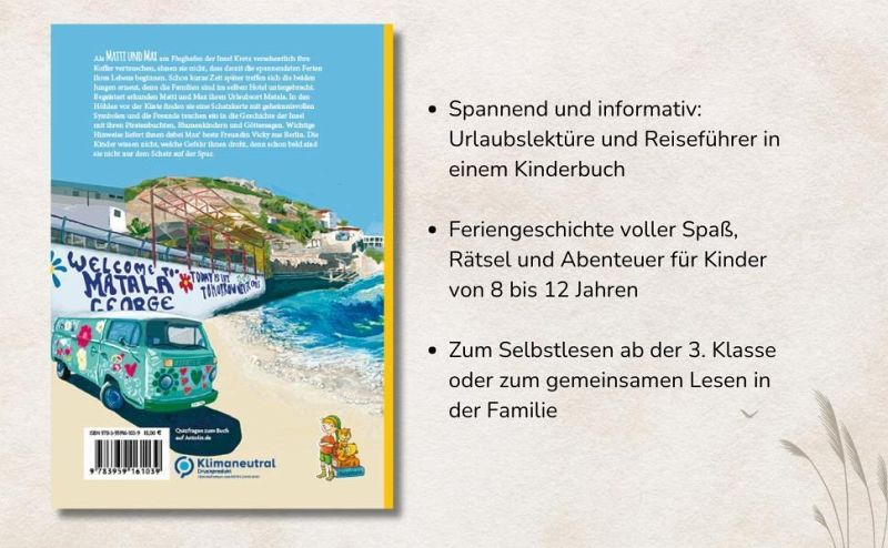 Als Matti und Max am Flughafen der Insel Kreta versehentlich ihre Koffer vertauschen, ahnen sie nicht, dass damit die spannendsten Ferien ihres Lebens beginnen. Schon kurze Zeit später treffen sich die beiden Jungen erneut, denn die Familien sind im selben Hotel untergebracht. Begeistert erkunden Matti und Max ihren Urlaubsort Matala. In den Höhlen vor der Küste finden sie eine Schatzkarte mit geheimnisvollen Symbolen und die Freunde tauchen ein in die Geschichte der Insel mit ihren Piratenbuchten, Blumenkindern und Göttersagen. Wichtige Hinweise liefert ihnen dabei Max' beste Freundin Vicky aus Berlin. Die Kinder ahnen nicht, welche Gefahr ihnen droht, denn schon bald sind sie nicht nur dem Schatz auf der Spur.