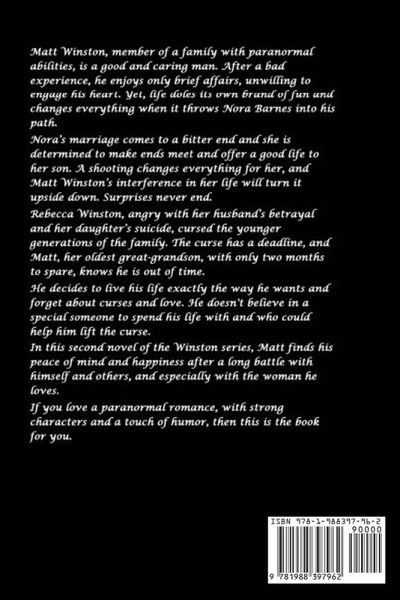 Matt Winston, member of a family with paranormal abilities, is a good and caring man. After a bad experience, he enjoys only brief affairs, unwilling to engage his heart. Yet, life doles its own brand of fun and changes everything when it throws Nora Barnes into his path. Nora's marriage comes to a bitter end and she is determined to make ends meet and offer a good life to her son. A shooting changes everything for her, and Matt Winston's interference in her life will turn it upside down. Surprises never end. Rebecca Winston, angry with her husband's betrayal and her daughter's suicide, cursed the younger generations of the family. The curse has a deadline, and Matt, her oldest great-grandson, with only two months to spare, knows he is out of time. He decides to live his life exactly the way he wants and forget about curses and love. He doesn't believe in a special someone to spend his life with and who could help him lift the curse. In this second novel of the Winston series, Matt finds his peace of mind and happiness after a long battle with himself and others, and especially with the woman he loves. If you love a paranormal romance, with strong characters and a touch of humor, then this is the book for you.
