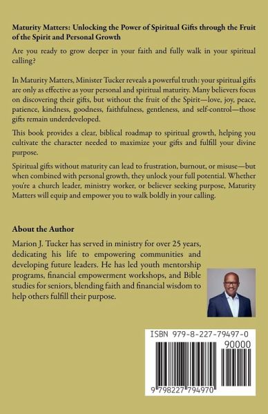 Maturity Matters: Unlocking the Power of Spiritual Gifts through the Fruit of the Spirit and Personal Growth Are you ready to grow deeper in your faith and fully walk in your spiritual calling? In Maturity Matters, Minister Tucker reveals a powerful truth: your spiritual gifts are only as effective as your personal and spiritual maturity. Many believers focus on discovering their gifts, but without the fruit of the Spirit-love, joy, peace, patience, kindness, goodness, faithfulness, gentleness, and self-control-those gifts remain underdeveloped. This book provides a clear, biblical roadmap to spiritual growth, helping you cultivate the character needed to maximize your gifts and fulfill your divine purpose. Through practical insights, real-life examples, and biblical wisdom, you'll learn how to: -Deepen your relationship with God while strengthening your spiritual gifts -Overcome personal obstacles that hinder your growth -Cultivate the fruit of the Spirit for lasting transformation -Align your gifts with godly character to impact those around you Spiritual gifts without maturity can lead to frustration, burnout, or misuse-but when combined with personal growth, they unlock your full potential. Whether you're a church leader, ministry worker, or believer seeking purpose, Maturity Matters will equip and empower you to walk boldly in your calling. Your gifts are powerful-but your growth is what makes them shine. Start your journey today!