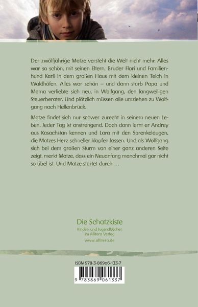 Der zwölfjährige Matze versteht die Welt nicht mehr. Alles war so schön, mit Mama und Papa, Bruder Flori und Familienhund Karli in dem großen Haus mit dem kleinen Teich in Waldhöfen. Alles war schön und dann starb Papa und Mama verliebte sich neu, in Wolfgang, den langweiligen Steuerberater. Und plötzlich müssen alle umziehen zu Wolfgang nach Hellenbrück. Matze findet sich nur schwer zurecht in seinem neuen Leben. Jeder Tag ist schwierig. Doch dann lernt er Andrey aus Kasachstan kennen und Lara mit den Sprenkelaugen, die Matzes Herz schneller klopfen lassen. Und als Wolfgang sich bei dem großen Sturm von einer ganz anderen Seite zeigt, merkt Matze, dass ein Neuanfang manchmal gar nicht so übel ist. Und Matze startet durch