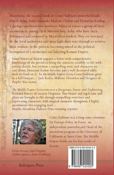 Mauretania, the second book in Conn Hallinan's powerful Middle Empire series, finds comrades Marcus, Flavius and Demartus leading a daring expedition into northern Africa to rescue a group of their countrymen, among them Marcus's love Aelia, who have been kidnapped and enslaved by Mauri slave traders. They are betrayed by the local authorities and must fight their way through to achieve their mission, in the process becoming mired in the political corruption of a weakened and faltering Roman Empire.