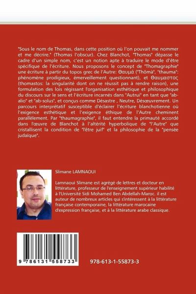 "Sous le nom de Thomas, dans cette position où l'on pouvait me nommer et me décrire." (Thomas l'obscur). Chez Blanchot, "Thomas" dépasse le cadre d'un simple nom, c'est un notion apte à traduire le mode d'être spécifique de l'écriture. Nous proposons le concept de "Thomagraphie" une écriture à partir du topos grec de l'Autre: ("Thômà", "thauma": phénomène prodigieux, émerveillement questionnant), et (thomastos: la singularité dont on ne réussit pas à rendre raison), une formulation des lois régissant l'organisation esthétique et philosophique du discours sur le sens et l'écriture incarnés dans "Autrui" en tant que "ab-alio" et "ab-solus", et conçus comme Désastre , Neutre, Dés uvrement. Un parcours interprétatif susceptible d'éclairer l'écriture blanchotienne où l'exigence esthétique et l'exigence éthique de l'Autre cheminent parallèlement. Par "thaumagraphie", il faut entendre la primauté accordé dans l' uvre de Blanchot à l'altérité hyperbolique de "l'Autre" que cristallisent la condition de "l'être juif" et la philosophie de la "pensée judaïque".