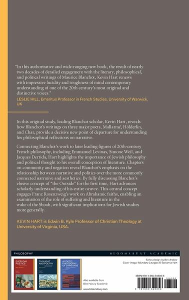 Blanchot and his writings on three major poets, Mallarmé, Hölderlin, and Char, provide a decisive new point of departure for English language criticism of his philosophical writings on narrative in this study by leading Blanchot scholar, Kevin Hart. Connecting his work to later leading figures of 20th-century French philosophy, including Emmanuel Levinas, Simone Weil, and Jacques Derrida, Hart highlights the importance of Jewish philosophy and political thought to his overall conception of literature. Chapters on community and negation reveal Blanchot's emphasis on the relationship between narrative and politics over the more commonly connected narrative and aesthetics. By fully discussing Blanchot's elusive concept of "the Outside" for the first time, this book progresses scholarly understandings of his entire oeuvre further. This central concept engages Franz Rosenzweig's work on Abrahamic faiths, enabling a reckoning on the role of suffering and literature in the wake of the Shoah, with significant implications for Jewish studies more generally.