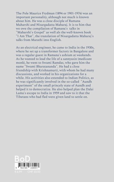 The Pole Maurice Frydman (1894 or 1901-1976) was an important personality, although not much is known about him. He was a close disciple of Ramana Maharshi and Nisargadatta Maharaj. It is to him that we owe the compilation of Ramana's talks in "Maharshi's Gospel" as well as the well-known book "I Am That", the translation of Nisargadatta Maharaj's talks from Marathi into English, which made Nisargadatta famous. As an electrical engineer, he came to India in the 1930s, where he set up a transformer factory in Bangalore and was a regular visitor to Ramana's ashram at weekends. As he wanted to lead the life of a sannyasin (mendicant monk), he went to Swami Ramdas, who gave him the name "Swami Bharatananda". He had a close friendship with Krishnamurti and worked in his organizations for a time. His activities also extended to Indian politics, as he was significantly involved in the so-called "Aundh experiment" of the small princely state of Aundh and helped it to democratize. He also helped plan the Dalai Lama's escape to India in 1959 and ensured that the Tibetans who had fled were given land to settle on.