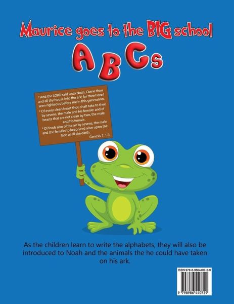 This workbook will help children learn to write the alphabet. It has upper and low case letters for them to trace. Each letter will have a picture of an animal that Noah could have taken on the Ark. On the back of the workbook, it gives the scripture of the Lord telling Noah what to take with him. The children will learn how to write their letters and they will learn scripture at the same time. I hope that this workbook will create a dialogue between parents and children about the bible and all the wonderful stories and lessons it tells.