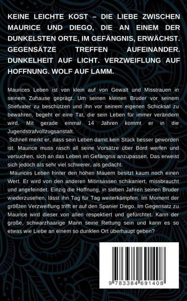 Spice-Level: 4/5 (explizite Szenen, roh & emotional)Keine leichte Kost - die Liebe zwischen Maurice und Diego, die an einem der dunkelsten Orte erwächst: im Gefängnis.Gegensätze treffen aufeinander. Dunkelheit auf Licht. Verzweiflung auf Hoffnung. Wolf auf Lamm.Hat diese Liebe eine Chance?Maurices Leben ist von klein auf von Gewalt und Misstrauen in seinem Zuhause geprägt.Um seinen kleinen Bruder Levin vor dem Stiefvater zu beschützen und ihm dasselbe Schicksal zu ersparen, begeht er eine Tat, die sein Leben für immer verändern wird.Mit gerade einmal 14 Jahren kommt er in die Jugendstrafvollzugsanstalt.Schnell merkt er, dass sein Leben dadurch kein Stück besser geworden ist. Maurice muss all seine Vorsätze über Bord werfen und versuchen, sich an das Leben im Gefängnis anzupassen - was sich jedoch als sehr viel schwerer erweist, als gedacht.Hinter den hohen Mauern besitzt Maurices Leben kaum noch einen Wert. Er wird von den anderen Insassen schikaniert, missbraucht und angefeindet.Einzig die Hoffnung, in sieben Jahren seinen Bruder wiederzusehen, lässt ihn Tag für Tag weiterkämpfen.Im Moment seiner größten Verzweiflung trifft er auf den Spanier Diego.Im Gegensatz zu Maurice wird dieser von allen respektiert und gefürchtet.Kann der große, schwarzhaarige Mann seine Rettung sein - und kann es so etwas wie Liebe an einem so dunklen Ort überhaupt geben?Gay Prison Romance · Dark Romance · Enemies to Lovers · Age Gap · Violence & Redemption · Hoffnung im Dunkel · Queer Love with Scars · Heartbreaking & Healing