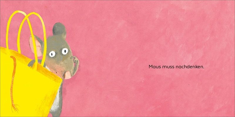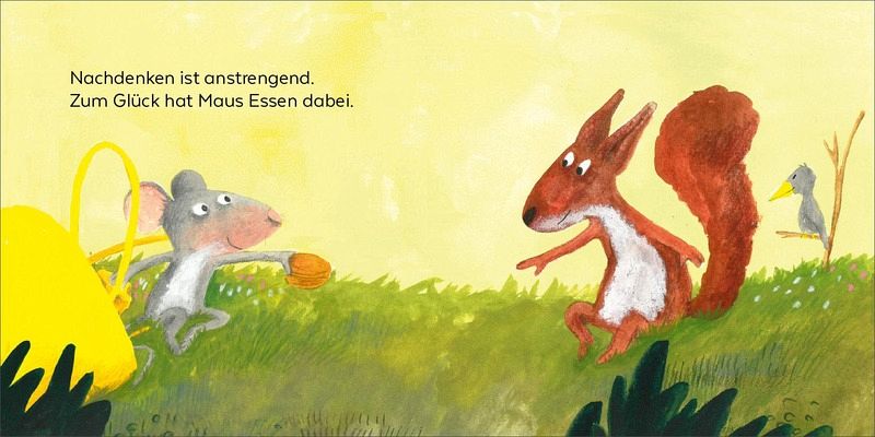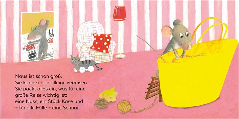 Zunächst packt Maus, die schon groß ist und alleine verreisen kann, ihre Tasche. Was sie mitnimmt, ist doch etwas ungewöhnlich. Schon vor der Höhle trifft sie Eichhörnchen, das sie nach ihrem Ziel