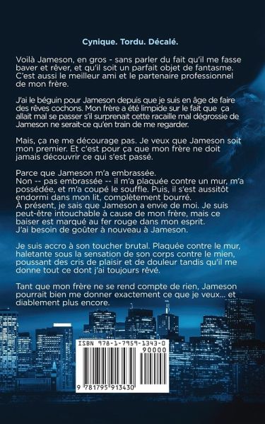 Cynique. Tordu. Décalé. Voilà Jameson, en gros - sans parler du fait qu'il me fasse baver et rêver, et qu'il soit un parfait objet de fantasme. C'est aussi le meilleur ami et le partenaire professionnel de mon frère. J'ai le béguin pour Jameson depuis que je suis en âge de faire des rêves cochons. Mon frère a été limpide sur le fait que ça allait mal se passer s'il surprenait cette racaille mal dégrossie de Jameson ne serait-ce qu'en train de me regarder. Mais, ça ne me décourage pas. Je veux que Jameson soit mon premier. Et c'est pour ça que mon frère ne doit jamais découvrir ce qui s'est passé. Parce que Jameson m'a embrassée. Non -- pas embrassée -- il m'a plaquée contre un mur, m'a possédée, et m'a coupé le souffle. Puis, il s'est aussitôt endormi dans mon lit, complètement bourré. À présent, je sais que Jameson a envie de moi. Je suis peut-être intouchable à cause de mon frère, mais ce baiser est marqué au fer rouge dans mon esprit. J'ai besoin de goûter à nouveau à Jameson. Je suis accro à son toucher brutal. Plaquée contre le mur, haletante sous la sensation de son corps contre le mien, poussant des cris de plaisir et de douleur tandis qu'il me donne tout ce dont j'ai toujours rêvé. Tant que mon frère ne se rend compte de rien, Jameson pourrait bien me donner exactement ce que je veux... et diablement plus encore. Ce roman de 50 000 mots est la première partie de l'histoire d'Emma et Jameson. Il est extrêmement sexy, et se termine sur un suspense haletant... vous allez brûler d'envie de savoir ce qui se passe ensuite !