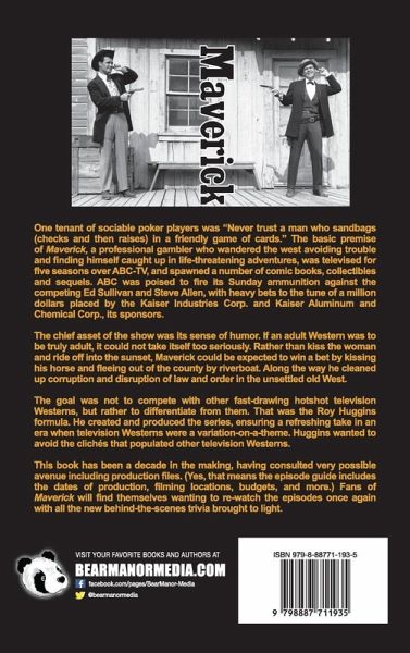 One tenant of sociable poker players was "Never trust a man who sandbags (checks and then raises) in a friendly game of cards." The basic premise of Maverick, a professional gambler who wandered the west avoiding trouble and finding himself caught up in life-threatening adventures, was televised for five seasons over ABC-TV, and spawned a number of comic books, collectibles and sequels. ABC was poised to fire its Sunday ammunition against the competing Ed Sullivan and Steve Allen, with heavy bets to the tune of a million dollars placed by the Kaiser Industries Corp. and Kaiser Aluminum and Chemical Corp., its sponsors. The chief asset of the show was its sense of humor. If an adult Western was to be truly adult, it could not take itself too seriously. Rather than kiss the woman and ride off into the sunset, Maverick could be expected to win a bet by kissing his horse and fleeing out of the county by riverboat. Along the way he cleaned up corruption and disruption of law and order in the unsettled old West. The goal was not to compete with other fast-drawing hotshot television Westerns, but rather to differentiate from them. That was the Roy Huggins formula. He created and produced the series, ensuring a refreshing take in an era when television Westerns were a variation-on-a-theme. Huggins wanted to avoid the clichés that populated other television Westerns. This book has been a decade in the making, having consulted very possible avenue including production files. (Yes, that means the episode guide includes the dates of production, filming locations, budgets, and more.) Fans of Maverick will find themselves wanting to re-watch the episodes once again with all the new behind-the-scenes trivia brought to light.