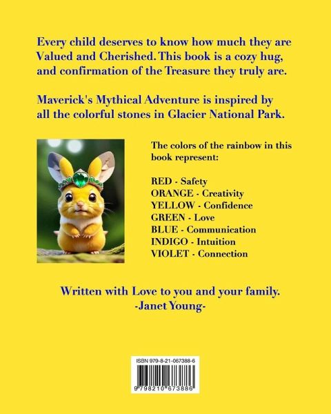 On Maverick's quest to find the mythical gemstones in Glacier National Park, he is met by seven animal friends who share heart-warming and powerful messages as he makes his way to the Sacred Pools. Maverick learns about the rainbow colors, and what they represent: RED-Safety, ORANGE-Creativity, YELLOW-Confidence, GREEN-Love, BLUE-Communication, INDIGO-Intuition, VIOLET-Connection. Although Maverick is on a journey searching for treasures, he learns that HE is the most valuable treasure of all. And he is LOVED!