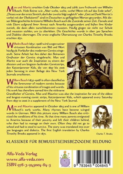 Max und Moritz erschien Ende Oktober 1865 und zählt zum Frühwerk von Wilhelm Busch. Viele Reime wie "Aber wehe, wehe, wehe! Wenn ich auf das Ende sehe!", "Dieses war der erste Streich, doch der zweite folgt sogleich" oder "Gott sei Dank! Nun ist's vorbei mit der Übeltäterei!" sind im Deutschen zu geflügelten Worten geworden. Mit dieser Bildergeschichte kritisierte Wilhelm Busch auch die Zustände seiner Zeit. Damals sind viele Eltern aufgrund ihrer Armut nach Amerika ausgewandert und ließen ihre Kinder zurück, die dann allein zurechtkommen mussten. Häufig gingen sie nicht zur Schule und mussten stehlen, um zu überleben. Die Geschichte wurde in über 300 Sprachen und Dialekte übertragen. Die erste englische Übersetzung von Charles Timothy Brooks erschien 1871.Max and Maurice appeared in October 1865 and is one of William Busch's early works. Many rhymes have become winged words in German. With this picture story William Busch also criticized the conditions of his time. At that time many parents emigrated to America because of their poverty and left their children behind, who then had to manage on their own. Often they did not go to school and had to steal to survive. The story was translated into over 300 languages and dialects. The first English translation by Charles Timothy Brooks appeared in 1871.