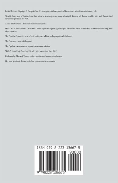 Buried Treasure. Big dogs. A Gang of Cats. A kidnapping. And tangles with Maintenance Man. Maxitude in every tale. Trouble has a way of finding Max, but when he teams up with young schoolgirl, Tammy, it's double trouble. Max and Tammy find adventures galore in The Park. Across The Universe - A treasure hunt with a surprise. Hold On To Your Dreams - A visit to a horse is just the beginning of the pals' adventures when Tammy falls and they spend a long, dark night together. The Paradise Circus - A circus of performing cats, a Diva, and a gang of really bad cats. The Passenger - Max is kidnapped. The Pipeline - A storm turns a game into a rescue mission. With A Little Help From My Friends - Max is mistaken for a thief. Kathmandu - Max and Tammy explore a trailer and become crimebusters. Get your Maxitude double with these humorous adventure tales.