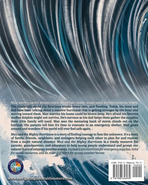 A hurricane is barrelling toward Max's coastal home. Max is scared. What will happen to his family and friends and home as this monster storm roars in? Max knows about hurricanes. Over the years, some have hit his coastal town. The locals talk about ferocious winds, heavy rain, and flooding. His mom and dad are worried about the hurricane, which is getting stronger by the hour. Max worries his home could be blown away. He's nervous as his dad helps them gather the supplies they will need. When his parents tell him it's time to evacuate to an emergency shelter, Max wonders if his world will ever feel safe again. Max and the Mighty Hurricane explores the natural fears of a young boy who is forced to face the possible loss of his life, his home, and the people he loves. As Max and his family, friends, and neighbors come together, they show us the power of community in the face of a major natural disaster. Max and the Mighty Hurricane is an engaging resource for parents, grandparents, and educators to help young people understand and accept our natural fears of extreme weather events and plan ahead to survive them. Included are checklists for emergency supplies, links for online resources, and an Award of Merit for young weather heroes.