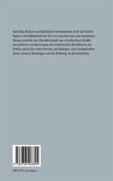 Nach Max Beckers unerklärlichem Verschwinden stellt die Familie Papiere und Dokumente der Zeit von 1940 bis etwa 1990 zusammen. Daraus entsteht eine Charakterstudie aus verschiedenen Erzählperspektiven: ein Kurzroman mit traditionellen Berichten in der dritten und in der ersten Person, mit Dialogen, einer dramatischem Szene, inneren Monologen und der Reihung von Bruchstücken.