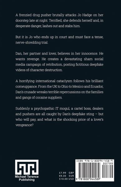 A frenzied drug pusher brutally attacks Jo Hadge on her doorstep late at night. Terrified, she defends herself and, in desperate danger, lashes out and stabs him. But it is Jo who ends up in court and must face a tense, nerve-shredding trial. Dan, her partner and lover, believes in her innocence. He wants revenge. He creates a devastating sham social media campaign of retribution, posting fictitious deepfake videos of character destruction. A horrifying international cataclysm follows his brilliant comeuppance. From the UK to Ohio to Mexico and Ecuador, Dan's crusade wreaks terrible repercussions on the families and gangs of cocaine suppliers. Suddenly a psychopathic IT mogul, a cartel boss, dealers and pushers are all caught by Dan's deepfake sting - but who will pay, and what is the shocking price of a lover's vengeance?