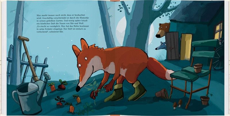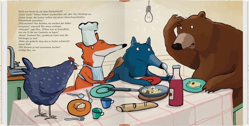 Ein fröhliches Bilderbuch für alle, die gerne über den Tellerrand gucken, und beim Lesen und Essen gerne etwas Neues ausprobieren! Zum Vorlesen geeignet für Kinder ab 4 Jahren. Der Fuchs Max liebt Gemüse und Obst und werkelt gern in seinem Garten. Die anderen Tiere, vor allem seine Freunde Bär und Wolf, finden das komisch. Das ist nicht normal. Als sie beobachten, wie Max ein Huhn beim Bauern schnappt, sind sie zufrieden und beschließen, sich beim Freund zum Essen einzuladen. Es duftet nämlich richtig lecker. Als aber das Huhn gesund und munter mit am Tisch sitzt, sind sie sprachlos: Huhn Wilma war nicht als Braten geplant, sondern sie hat die Eier für leckere Pilzomelettes gelegt! Wolf und Bär stellen überrascht fest, dass das vegetarische Essen köstlich schmeckt. Und außerdem: Zusammen schmeckt's am besten!