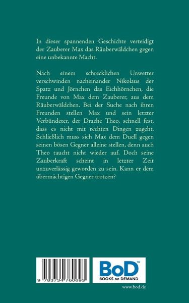 In dieser spannenden Geschichte verteidigt der Zauberer Max das Räuberwäldchen gegen eine unbekannte Macht. Nach einem schrecklichen Unwetter verschwinden nacheinander Nikolaus der Spatz und Jörnchen das Eichhörnchen, die Freunde von Max dem Zauberer, aus dem Räuberwäldchen. Bei der Suche nach ihren Freunden stellen Max und sein letzter Verbündeter, der Drache Theo, schnell fest, dass es nicht mit rechten Dingen zugeht. Schließlich muss sich Max dem Duell gegen seinen bösen Gegner alleine stellen, denn auch Theo taucht nicht wieder auf. Doch seine Zauberkraft scheint in letzter Zeit unzuverlässig geworden zu sein. Kann er dem übermächtigen Gegner trotzen?