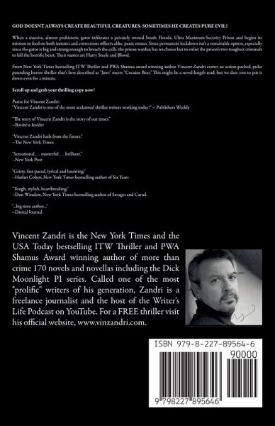 GOD DOESNT ALWAYS CREATE BEAUTIFUL CREATURES. SOMETIMES HE CREATES PURE EVIL! When a massive, almost prehistoric gator infiltrates a privately owned South Florida, Ultra Maximum-Security Prison and begins its mission to feed on both inmates and corrections officers alike, panic ensues. Since permanent lockdown isn't a sustainable option, especially since the gator is big and strong enough to breach the cells, the prison warden has no choice but to enlist the prison's two toughest criminals to kill the horrific beast. Their names are Harry Steele and Blood. From New York Times bestselling ITW Thriller and PWA Shamus award winning author Vincent Zandri comes an action-packed, pulse pounding horror thriller that's best described as "Jaws" meets "Cocaine Bear." This might be a novel-length read, but we dare you to put it down even for a minute. Scroll up and grab your thrilling copy now! Praise for Vincent Zandri: "Vincent Zandri is one of the most acclaimed thriller writers working today!" -- Publishers Weekly "The story of Vincent Zandri is the story of our times." --Business Insider "Vincent Zandri hails from the future." --The New York Times "Sensational . . . masterful . . . brilliant." --New York Post "Gritty, fast-paced, lyrical and haunting." --Harlan Coben, New York Times bestselling author of Six Years "Tough, stylish, heartbreaking." --Don Winslow, New York Times bestselling author of Savages and Cartel. "...big time author..." --Digital Journal