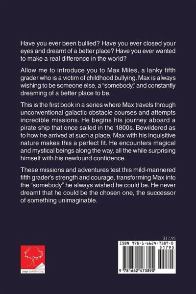 Have you ever been bullied? Have you ever closed your eyes and dreamt of a better place? Have you ever wanted to make a real difference in the world? Allow me to introduce you to Max Miles, a lanky fifth grader who is a victim of childhood bullying. Max is always wishing to be someone else, a "somebody," and constantly dreaming of a better place to be. This is the first book in a series where Max travels through unconventional galactic obstacle courses and attempts incredible missions. He begins his journey aboard a pirate ship that once sailed in the 1800s. Bewildered as to how he arrived at such a place, Max with his inquisitive nature makes this a perfect fit. He encounters magical and mystical beings along the way, all the while surprising himself with his newfound confidence. These missions and adventures test this mild-mannered fifth grader's strength and courage, transforming Max into the "somebody" he always wished he could be. He never dreamt that that he could be the chosen one, the successor of something unimaginable.