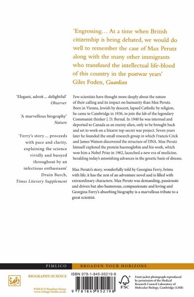 Few scientists have thought more deeply about their calling and its impact on humanity than Max Perutz (1914-2002). Born in Vienna Jewish by descent lapsed Catholic by religion Max came to Cambridge in 1936 to join the lab of the legendary Communist thinker J.D. Bernal. In 1940 he was interned and deported to Canada as an enemy alien only to be brought back and set to work on a bizarre top secret war project. Seven years later he founded the small research group in which Francis Crick and James Watson discovered the structure of DNA. Max Perutz himself explored the protein haemoglobin and his work which won him a shared Nobel Prize in 1962 launched a new era of medicine heralding today's astonishing advances in the genetic basis of disease. Max Perutz's story wonderfully told by Georgina Ferry brims with life; it has the zest of an adventure novel and is full of extraordinary characters. Max was demanding passionate and driven but also humorous compassionate and loving. Georgina Ferry's absorbing biography is a marvellous tribute to a great scientist.