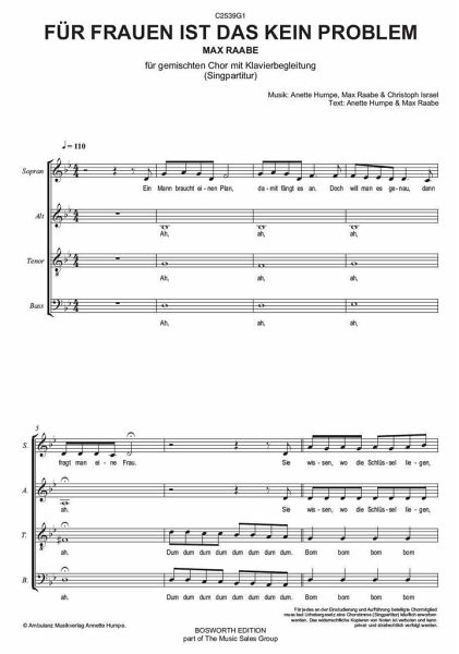 Der Titelsong 'Für Frauen ist das kein Problem' aus Max Raabes gleichnamigem Album von 2013, arrangiert für gemischten Chor SATB mit Klavierbegleitung. Das Set besteht aus der Klavierpartitur (8 Seiten) und der Singpartitur (8 Seiten) in 10facher Ausführung. Das Set kommt eingeschweisst in einer Chormappe. Klavier- und Singpartitur können einzeln über die Bosworth Chor Edition in Köln bezogen werden (0221-8906160; bosworthchor@web.de): C2539GP Klavierpartitur; C2539G1 Singpartitur.